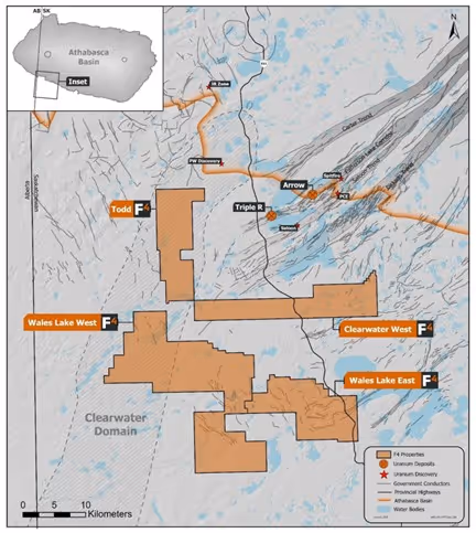 F4s Projekte im südwestlichen Athabasca Basin: Todd Lake, Wales Lake West/East und Clearwater West im Nachbarschaftsbezug zu Triple R, Arrow, Tetra, Spitfire und PCE. Karte: F4 Uranium Corp.