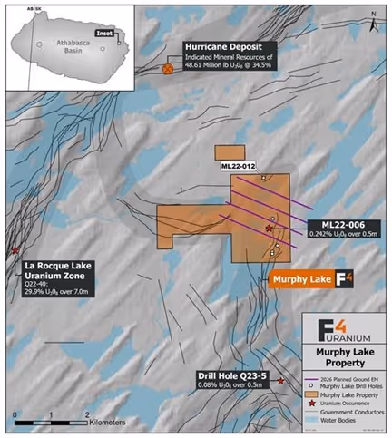 Murphy Lake Property - Lage 5 km südlich der Hurricane-Lagerstätte, mit ML22-006 (0,242% U₃O₈ über 0,5 m) und der für 2026 geplanten Ground-EM-Befliegung. Karte: F4 Uranium Corp.